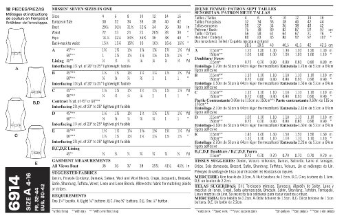 -. Feature : Misses Tops in size A (4-6-8-10-12-14-16), New Look Pattern #6914 / Number of looks included: 5 / Designed in UK, Manufactured in USA / Instructions are written in English, Spanish, and French