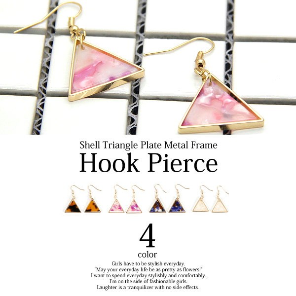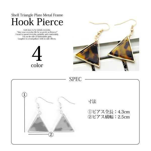 <<スーパーSUMMER SALE>>★全4色展開!シェルトライアングルプレートフックピアス★べっ甲カラーや渋めのネイビー系もあるオシャレなピアス!シンプルなのでつけやすいデザインです。キャッチがいらないフックピアスで楽ちん!■商品詳細■(画像9枚目を参照)ピアス全長:約4.3cmピアス横幅:約2.5cm※注意事項※商品画像はできる限り実物の色に近づけておりますが、モニター・パソコン等の画像解像度により実際の商品と多少色味が異なる場合がございます。サイズは平置きサイズとなりますので、測り方により誤差が出る場合がございます。予めご了承くださいますようお願いいたします。