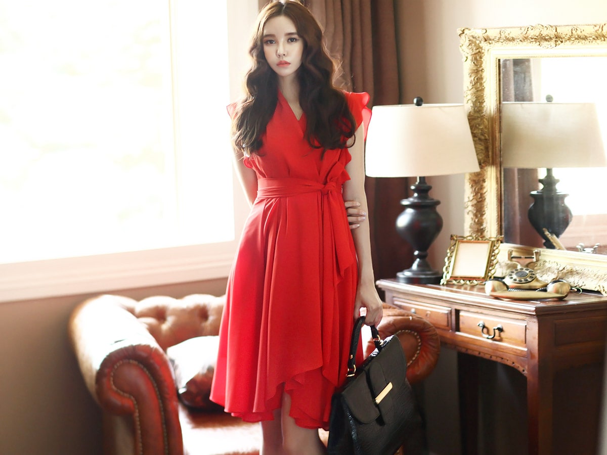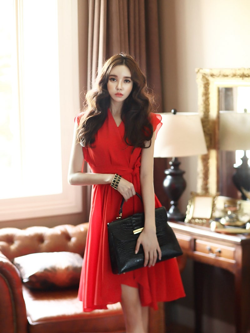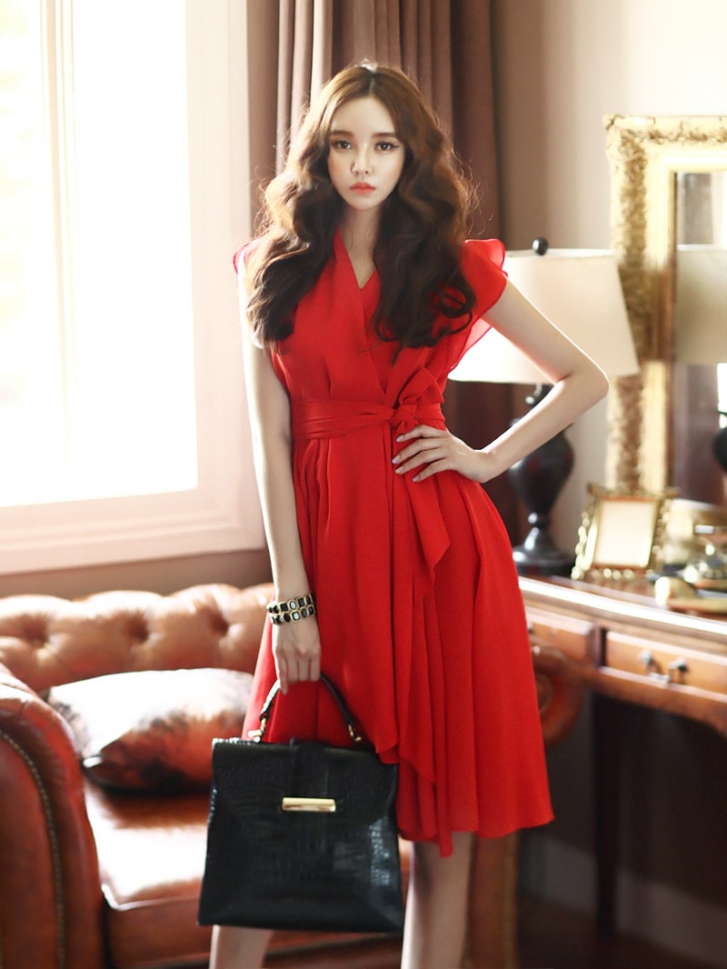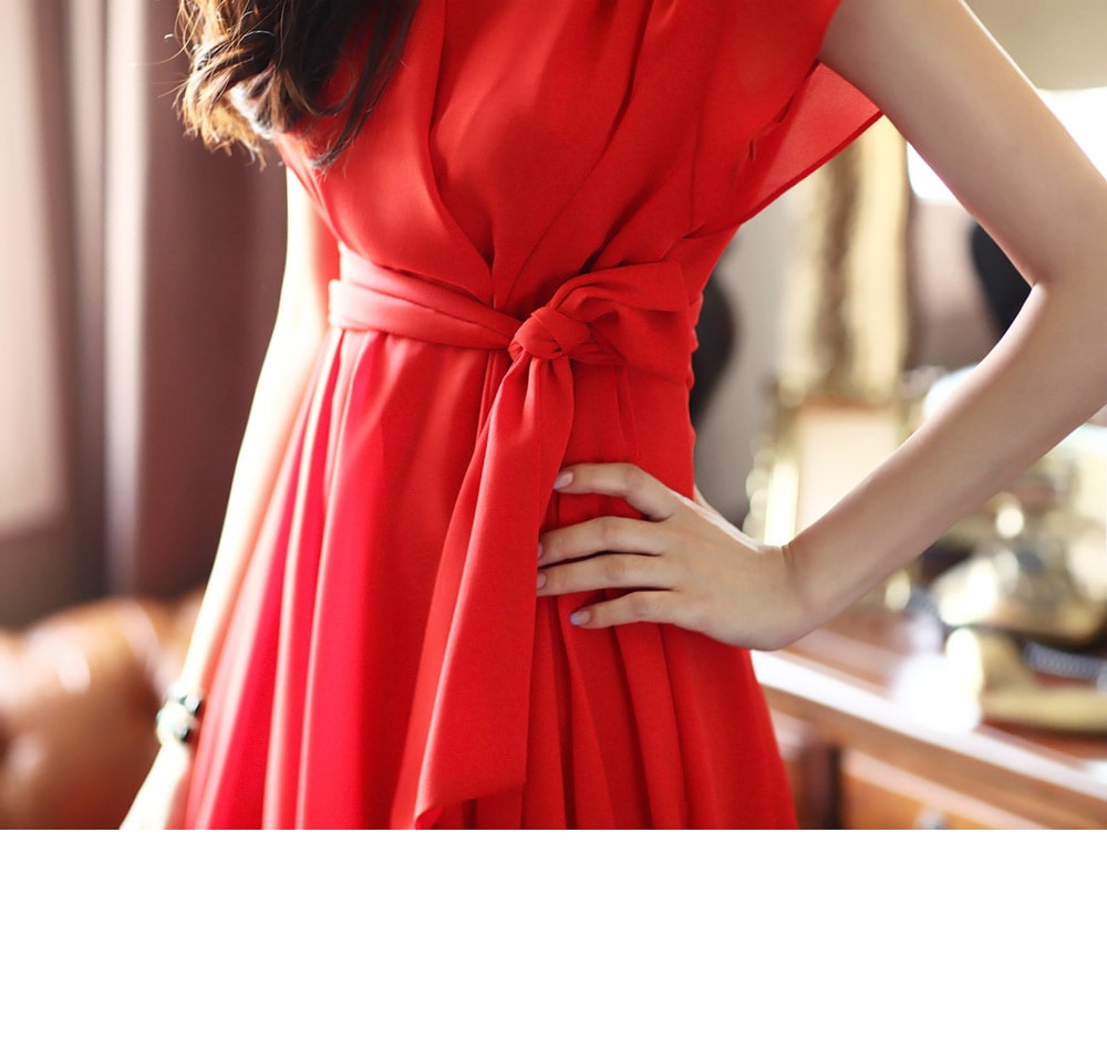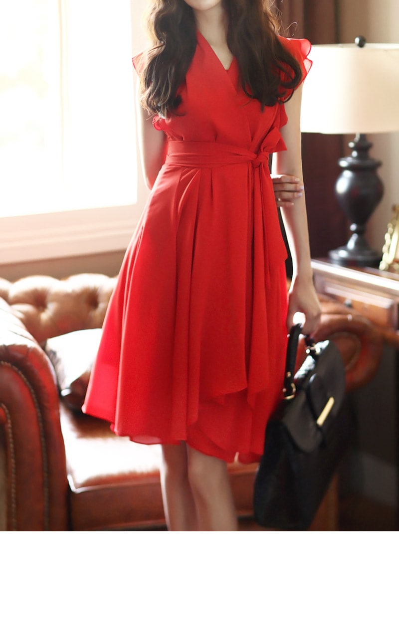 D2421 셔플리스 랩 쉬폰 플레어 원피스 -> Red