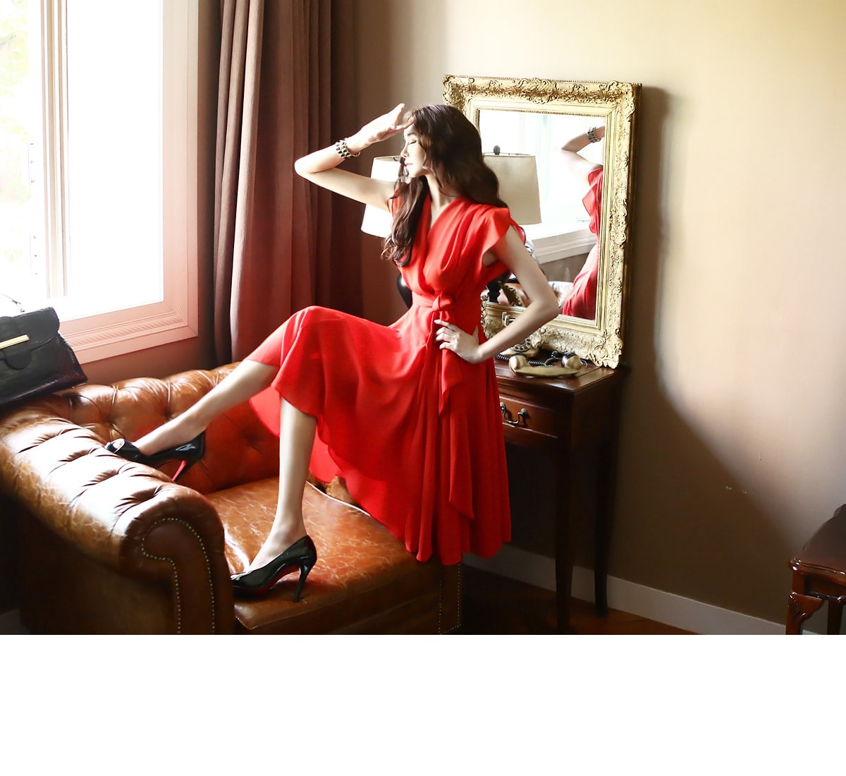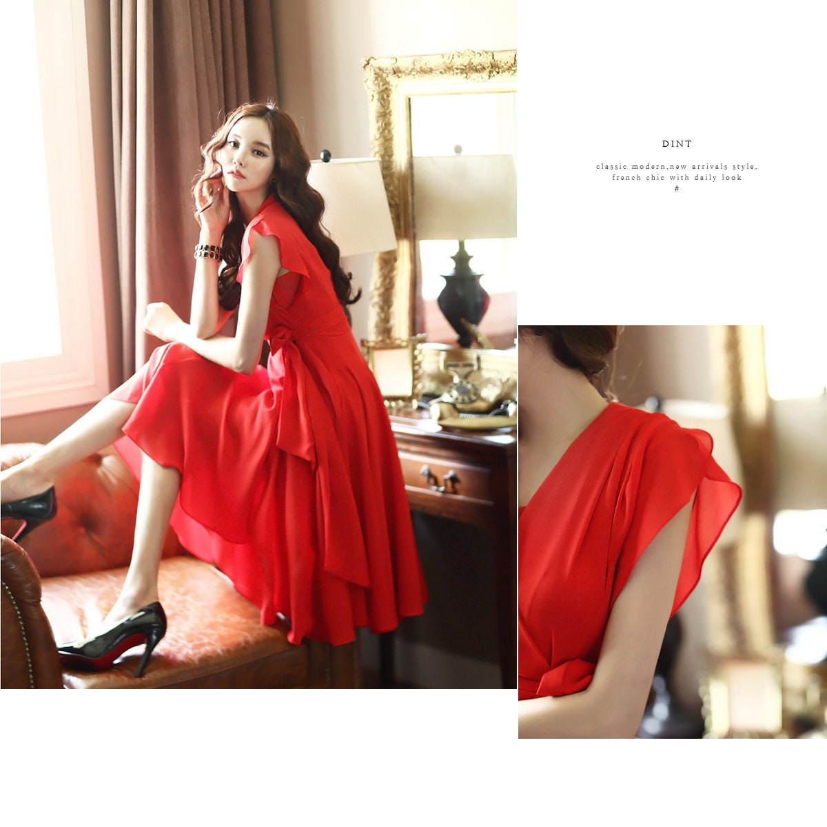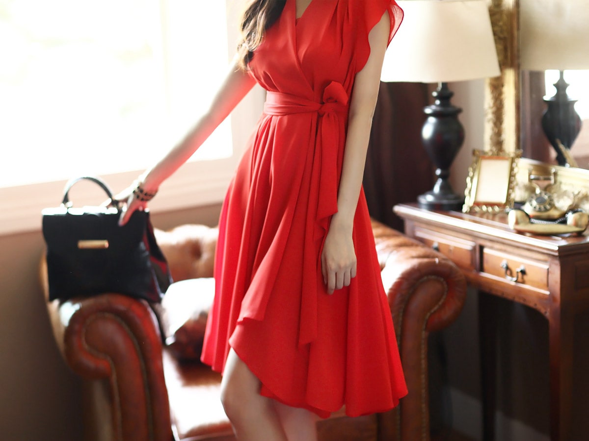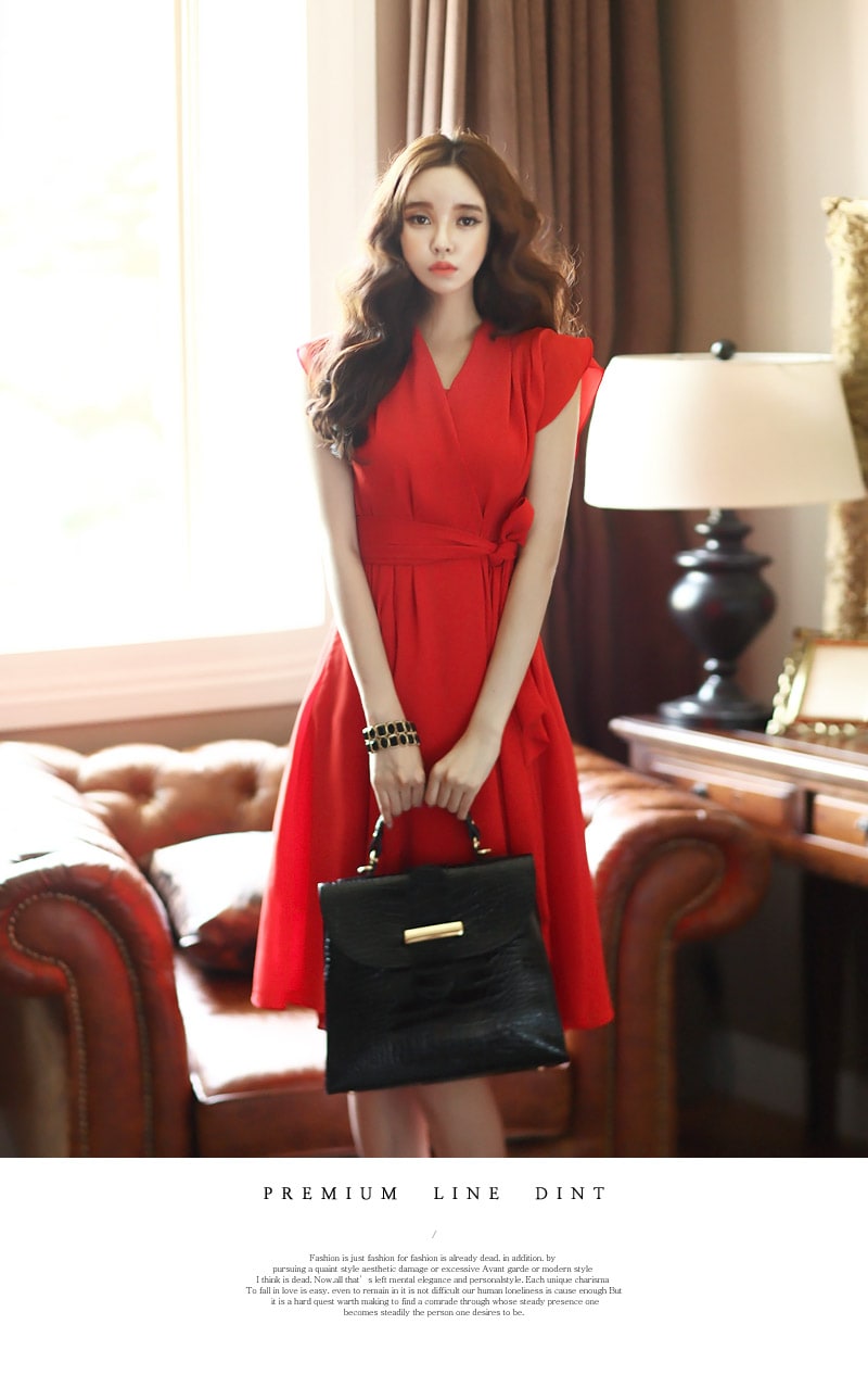 D2421 셔플리스 랩 쉬폰 플레어 원피스 -> Red