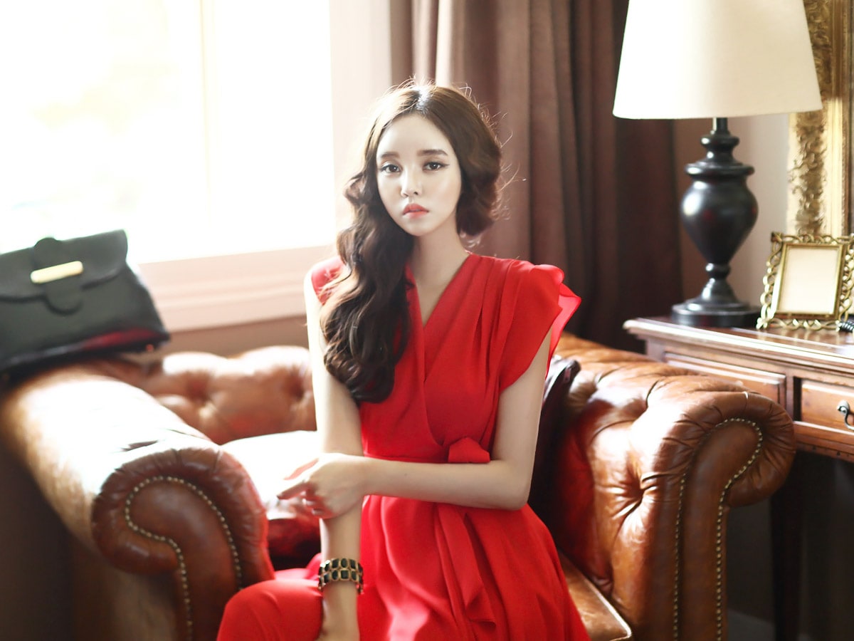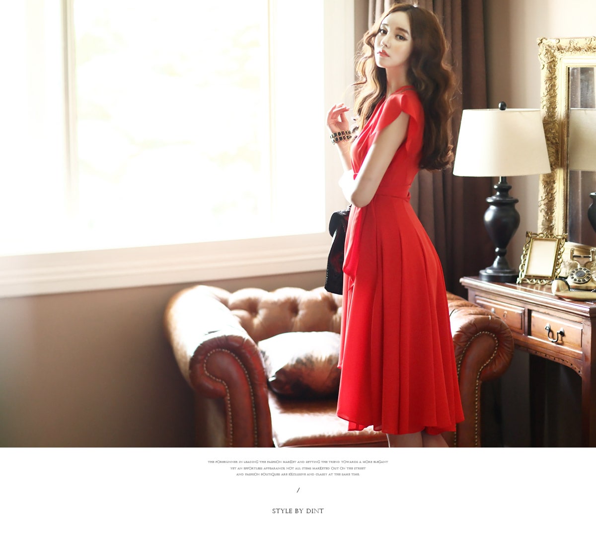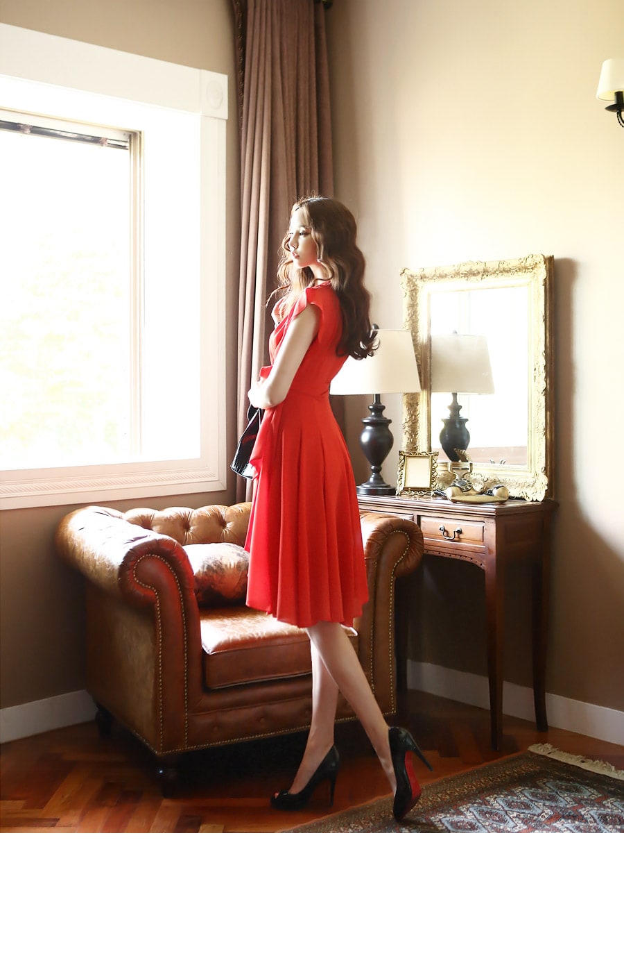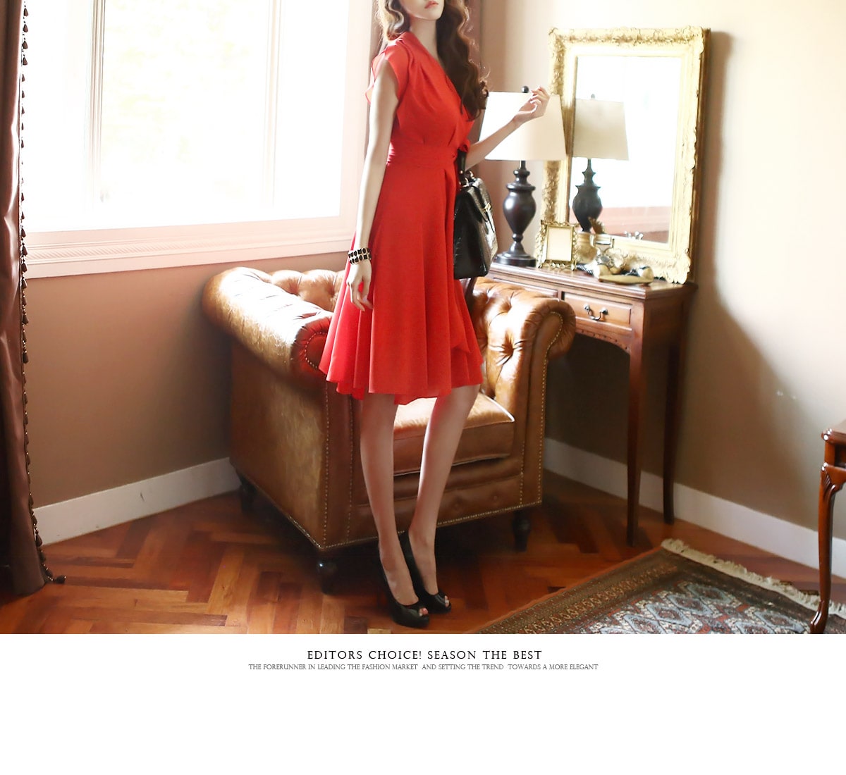 D2421 셔플리스 랩 쉬폰 플레어 원피스 -> Red
