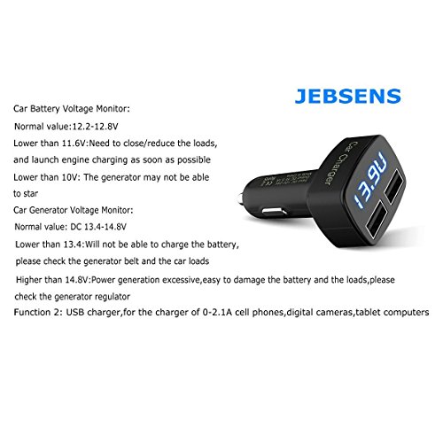 -. Feature : FAST DUAL USB CHARGING PORTS - Combined 3.1 amps; 15W; uses smart technology to ensure each device pulls the right amperage. Charger is powered by the vehicle's cigarette lighter. / OVER-CHARGE PROTECTION - auto power off when input/output is greater than safety current, protects against over-heat, over-current and over-charging / LED DISPLAY - LED digital luminescence tubes; Display cycles between internal temperature (Fahrenheit), device's charging current, and the voltage of the vehicle's car battery. (Note: When using the device to charge, it display the charger's temperature instead of the internal temperature of your car. ) The LEDs are bright enough to read the display without being a distraction while driving. / SPECIFICATIONS - Input: DC 12V - 24V, Output: DC 5V/3.1A, 15 W, Conversion efficiency 95%, Measuring range: Voltage 5V-25V, Current 0 - 3.1A, Temperature -4⁰ to 176⁰ F / Package Includes: 1 x JEBSENS 3.1A Dual USB Car Charger with LED Display. (Charging Cable NOT included) 1 Year Gurantee provided by Manufacturer. Money Back Guarantee from JebsensDirect. Want Car Charger with Voltage Display Only? Check out the 3.4A Dual Port Car Charger with Volt-display (ASIN: B01826Q3TU)! Another perfect partner is the No.1 Rated JEBSENS CA02 Magnetic Air Vent Car Mount (ASIN: B0144AX6WK).