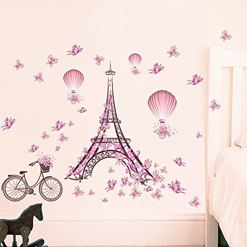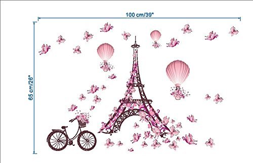 -. Title : Ferris Store Paris Tower Pink Cute Butterflies Art Decor Home Bedroom Living Room Background Waterproof Wall Stickers 39x26"