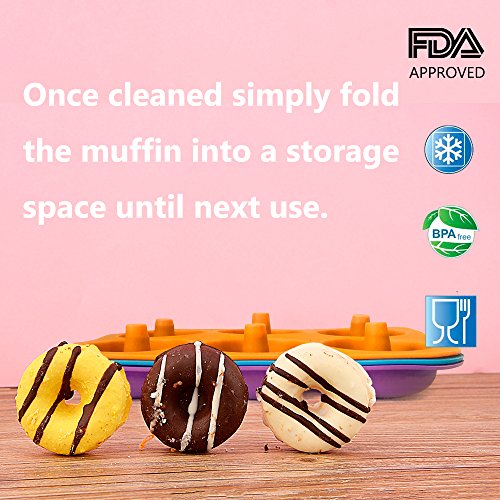 1. Premium quality fun color-high quality 100% food grade silicone,FDA approved BPA free. 2. Non-stick silicone- No need to spray this pan before using; the silicone mold is nonstick and easy to clean. 3. Heat-resistant- it doesn't melt in temperatures up to 450°F, Microwave/ Freezer/ Oven/ Dishwasher safe. 4. Fun Versatile-You can make Regular Donuts, Chocolate Cake Donuts, Gingerbread Donuts, Blue Berry Donuts! Great for the whole family!