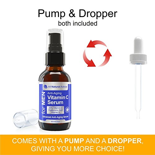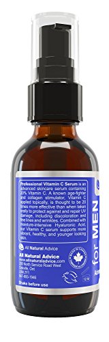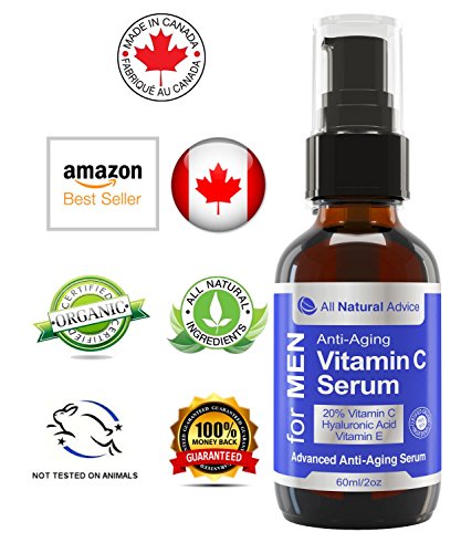 - Feature : NEW! 20% Vitamin C Serum made JUST FOR MEN and CERTIFED ORGANIC, a great complement for men from our Top Selling All Natural Advice Vitamin C Serum in Canada. An excellent choice for men to use after shaving. Includes a new enticing scent in a durable bottle to take on the road. We are a proud Canadian company using only premium Canadian ingredients! / Excellent for all SENSITIVE SKIN TYPES. Fads sun, age and brown spots, reduces wrinkles and fine lines and HIGHLY BENEFICIAL to treat scars and acne. / Comes with a PUMP and a DROPPER, giving you more choice! A uniquely Canadian absorbent anti-aging serum with Vitamin C Serum for your face and body. Watch as the depths of lines start reducing. Be amazed at the soft tingling feel on your face. Our 20% Vitamin C Serum has the moisturizing power of botanically derived hyaluronic acid, natural jojoba oil, and the tightening and retention power of Witch Hazel / 00% Money Back Guaranteed! We know you will love your clinical strength, vegan 20% vitamin c serum that will leave your skin radiant and more youthful by neutralizing free radicals and boosting collagen we offer no questions asked 100% money back guarantee. Why? That's just what good Canadian companies do! / DOUBLE THE SIZE of others offered at the same price 60 ml or a full 2 oz natural certified ingredients. Packed with powerful anitoxidants with the highest quality professional concentration 20% Vitamin C Serum for your face and body + Vitamin E + Hyaluronic Acid. We use the sodium ascorbyl phosphate version of the Vitamin C which is highly effective and more stable when compared to lower grade Vitamin C Serums. Formulated to be non-greasy and goes on smooth, absorbing deep into your skin and dries extra fast allowing you to apply other applications to your skin!