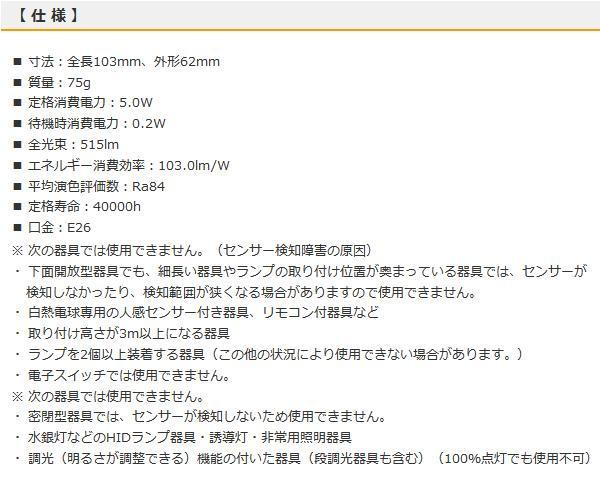 周囲が暗いとき人が近付くと自動点灯、離れると120秒後に自動消灯します。配光角約120度で、40形相当の明るさ。光色は電球色で屋内専用です。内玄関・廊下・階段・トイレにおすすめ! |