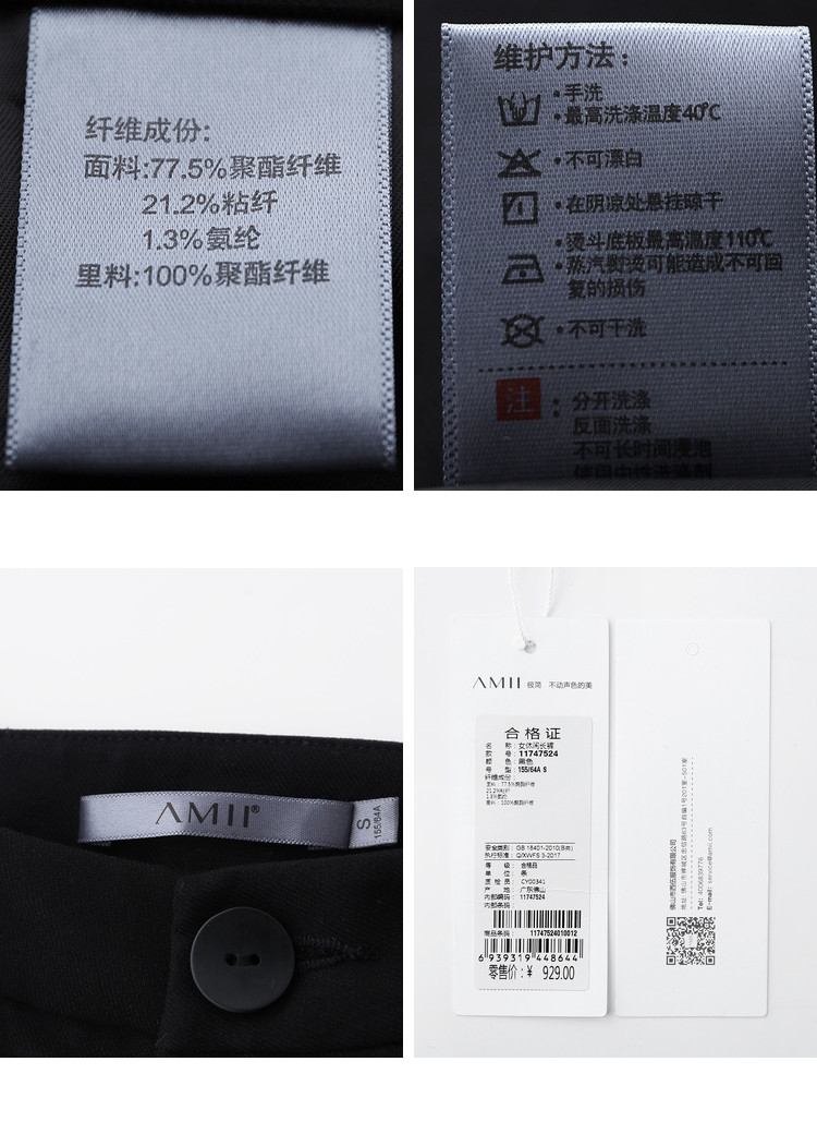| 面料成分: | 面料:77.5%聚酯纤维 21.2%粘纤 1.3%氨纶 里料:100%聚酯纤维 |