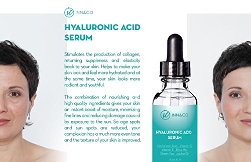 With Inn&Co's hyaluronic acid serum, your fine lines and wrinkles are minimized, signs of free radical damage, such as sun spots and age spots are reversed and collagen production is boosted.