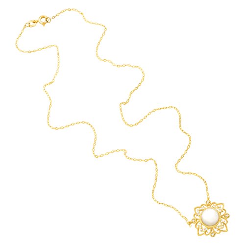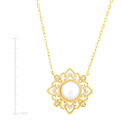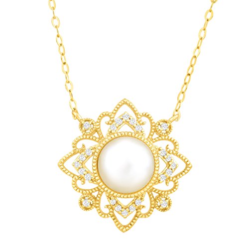 Embrace a classic look in this elegant filigree necklace. Featuring an 8 mm freshwater cultured pearl and diamonds totaling 1/10 ct, the necklace is crafted in 10K gold on a cable chain. Piece measures 3/4 by 3/4 inches with a total length of 17 inches. Pearls have been bleached to enhance their appearance.Feature