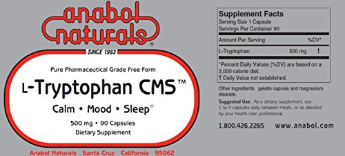 -. Feature : L-Tryptophan CMS, the world's absolute purest and highest quality L-Tryptophan / L-Tryptophan CMS has been used for medical applications through doctors, hospitals and other health care professionals / Because L-Tryptophan is converted to serotonin and melatonin in the body, it plays and important role in promoting relaxation, restful sleep and positive mood. / Since 1983 Anabol Naturals has been the most trusted name in free form amino acids, and L-Tryptophan CMS is THE MOST TRUSTED L-Tryptophan available. / 500 mg L-Tryptophan per capsule. 90 capsules. List P.R.Ice, $29.95. Your P.R.Ice, $17.95.