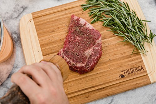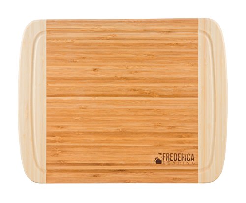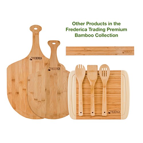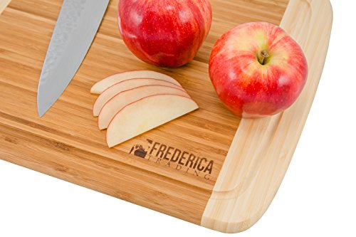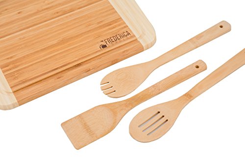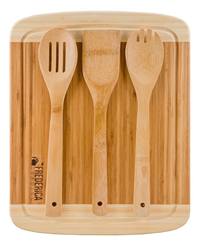 -. Feature : BONUS: Bamboo cutting board & chopping block comes with bonus BAMBOO WOODEN utensils, including the BAMBOO SPATULA, BAMBOO SLOTTED SPOON, and BAMBOO SLOTTED FORK. / ETHICALLY SOURCED from PREMIUM, ORGANIC BAMBOO, safe for the ENVIRONMENT, your HOME, KITCHEN, and FAMILY. The additional JUICE DRIP GROOVE keeps the juices from pouring off the board onto your kitchen counters and makes for EASIER CLEAN UP. / PERFECT SIZE for countertops and KITCHEN ISLANDS at approximately 14" long, 12" wide, and .8" thick, making this BAMBOO CUTTING BOARD the perfect size and weight. The PADDED NON-SLIP RUBBER FEET on the bottom corners of the chopping board help keep your cutting surface from slipping on your counters. / BEAUTIFUL two-tone bamboo finish highlights the elegant look and feel of the natural bamboo wood engraved with the classic FREDERICA TRADING logo design. Use as a cutting board for fruit, meats, wooden cheese board, butcher block, and as a chopping board for vegetables. / PERFECT GIFT for WEDDINGS, ENGAGEMENT PARTIES, HOUSE WARMING, MOTHER's DAY, BIRTHDAYS. This beautiful bamboo cutting board and utensil set is perfect for your KITCHEN, BAR, OUTDOOR KITCHEN, CAMPER and is a perfect addition to the FREDERICA TRADING BAMBOO COLLECTION of kitchen accessories.