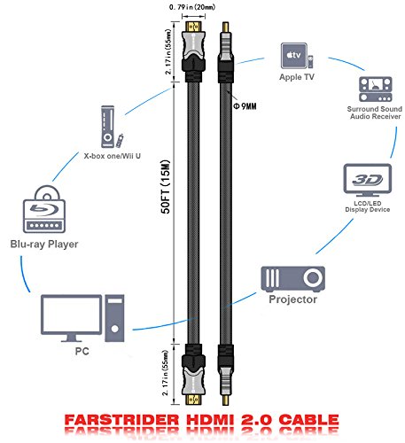 FARSTRIDER HDMI cable 2.0 Version Super High Quality with 3D Technology and Audio return(ARC)/CAT-2 HDMI Cable(Full 1080p/2160p approved),Full Ultra HD 4k support - 2160p (4096 X 2160 pixels),extended colour spaces such as xv Colour and Deep Colour.Supports 720p, 1080i,1080p and 2160p also Supports 4K x 2K Video and more color spare,Supports 54-Bit Deep Color for a Crispy Image.Supports True HD Dolby 7.1 and DTS-HD Master Audio,Support for all television with 1000Hz rates and above.