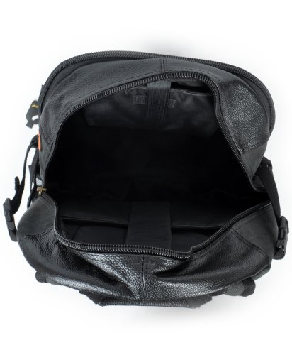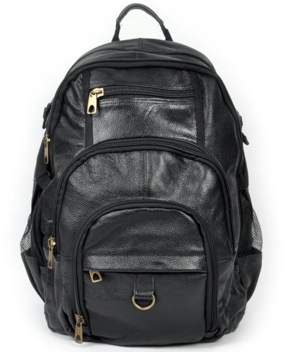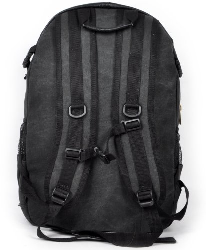-. Feature : Genuine leather and canvas style / Fits 16 inch laptop; 9.5 x 18 x 13 dimensions. / Contains 6 compartments to fit your essentials / Bottle holders on both sides of backpack; Strap across chest for weight control / Great for school, commuting or camping