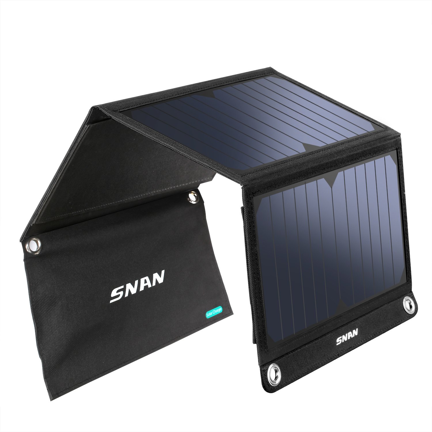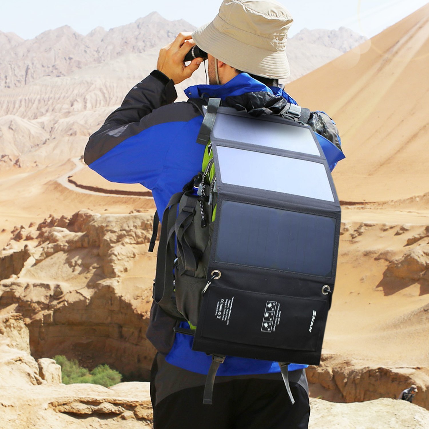 Open the solar panel, adjust so that the sun hits the whole panel, connect it to the device with a USB cable.