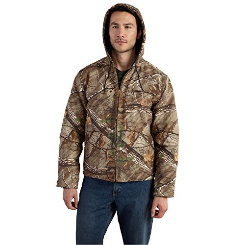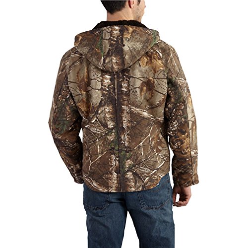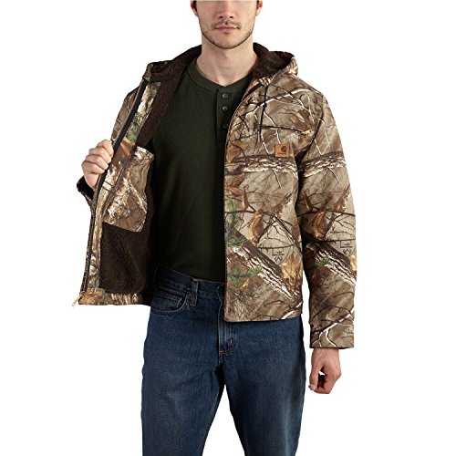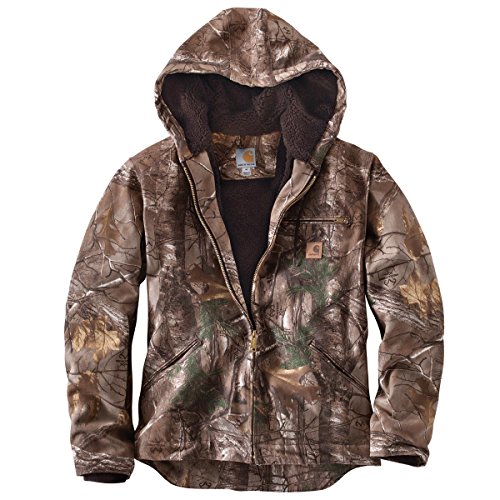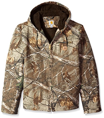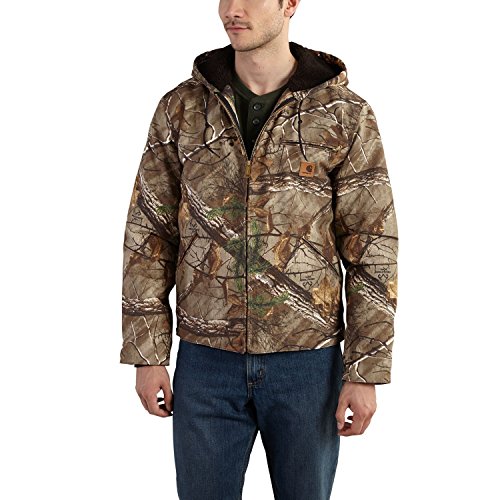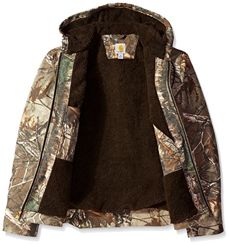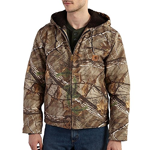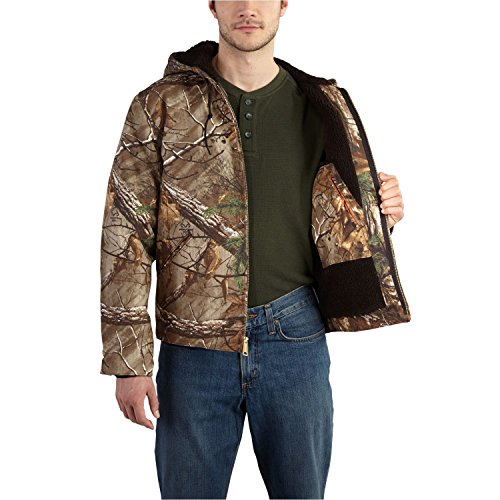 Studio : Carhartt Sportswear - Mens Publisher : Carhartt Sportswear - Mens Binding : Apparel Product Description Made in the USA by folks in Tennessee and kentucky. Made with warm sherpa. Made to go from work to woods without hesitation. 12-ounce, 100 percent cotton duck with real tree camo pattern, sherpa lining in body, quilted-nylon lining in sleeves, attached sherpa-lined hood, left-chest pocket with zipper, two inside pockets, two lower-front pockets, split-back construction and bi-swing back for ease of movement. 0