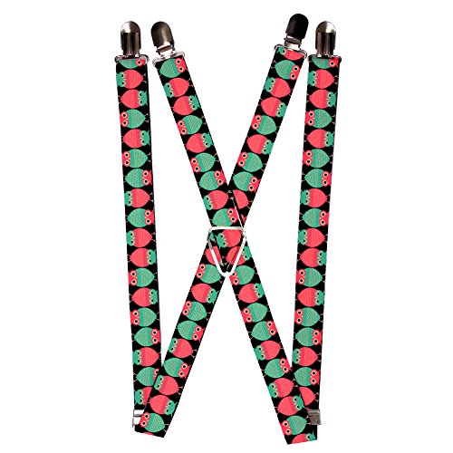 Pink and Green Owl and Upside Down Owl on Black Suspenders