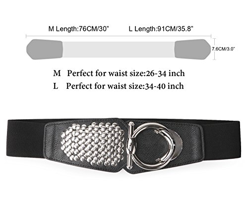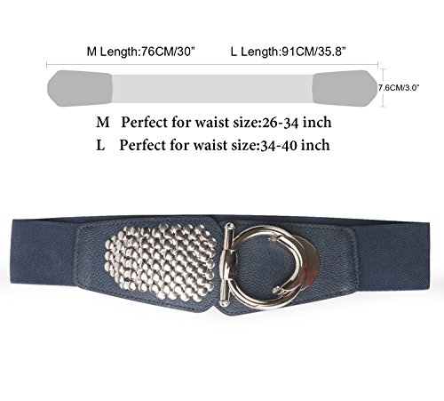 Binding : Apparel Product Description Features: Made of good craftsmanship,Good material, good stitching and plenty of stretch. Fashion Design with Unique?Rivets Studs element. One belt two kinds of wearing styles. A fashion statement for any occasions or seasons. Two sizes three colors for choice -size M suit for waist size 36-34inch,The total length is 29.9inch.Maximum stretch length: 95-100cm (37.4-39.3 inch). -size L suit for waist size 34-40inch,The total length is 35.8inch.Maximum stretch length: 110-115cm (43.3-45.3 inch).