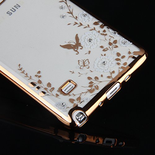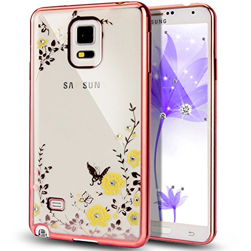 Galaxy Note 4 Case,ikasus White Butterfly Floral Flower Bling Crystal Rhinestone Diamonds Clear Rubber Golden Plating Frame Soft TPU Silicone GEL Protective Bumper Case Cover for Samsung Galaxy Note 4
