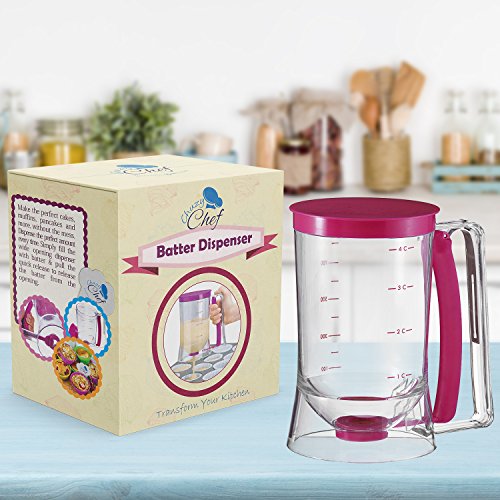 This dispenser neatly deposits the perfect amount of batter, resulting in consistently sized cupcakes that will bake evenly. Use for pancakes or other desserts too. Plastic. Hand wash. 4-cup capacity