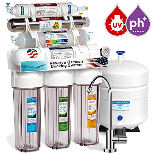 Express Water 11 Stage UV Ultraviolet + Alkaline + Reverse Osmosis Home Drinking Water Filtration System 100 GPD RO Membrane Filter - Modern Faucet - Clear Housing - Pressure Gauge
