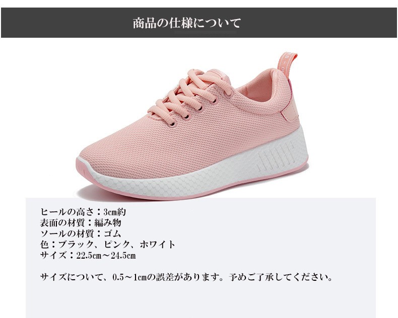 材質:メッシュ+ゴム色:ブラック、ホワイト、ピンクサイズについてEU35=22.5cm EU36=23cm EU37=23.5cm EU38=24cm EU39=24.5cm EU40=25cm注意:※ サイズなど、商品詳細を必ずご確認後、ご了承頂いた上でご購入をお願いします。また、採寸方法違いにより、0.5~1cmの誤差がございますので、ご了承ください。商品内容:1xスニーカー特徴:【軽量、通気性よい】ゴムのソールとポリエステルの材質でスポーツシューズならではの軽さを実現し、通気性もよいです。どんな季節でも着用します。 軽量なので、ランニングや歩くや他の運動が易くになりました。【男女兼用】純色な配色で、シューズがファッションになり、男性も女性も適用します。明るい色ので、着用した後、若くなりました。中学生などに通学靴としてもよい選択です。 【ソールが曲がる、耐滑】柔らかい材質で作って、ソールが曲がれるので、スムーズな足運びをサポートします。球技や他の運動にもスムーズになりました。【利用場合】スポーツだけでなく、通勤や通学やアウトドア、普段履きとしても カジュアルなコーディネートをお楽しみい ただけます。