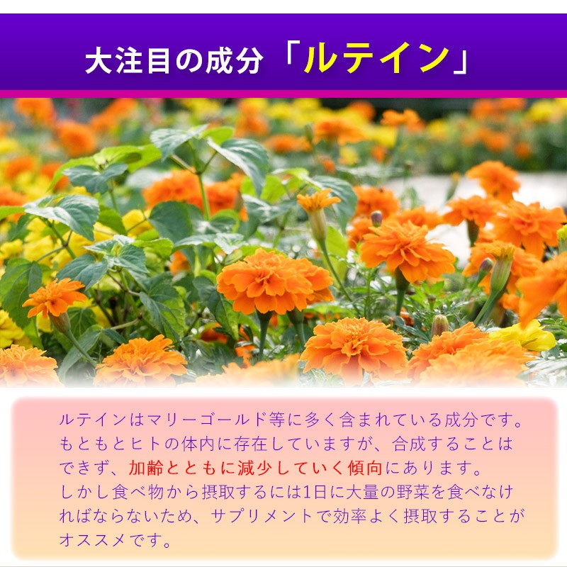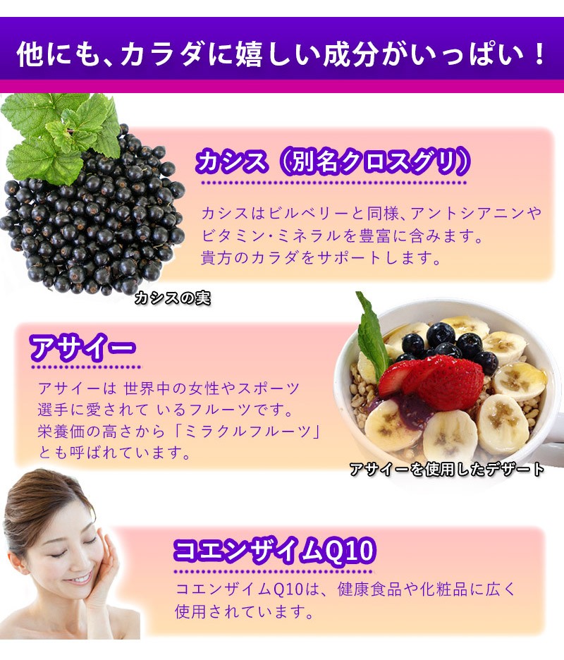 | 原材料 | デキストリン、還元麦芽糖水飴、ブルーベリーパウダー、ビルベリー抽出物、ビール酵母、カシス抽出物、鶏冠抽出物(ヒアルロン酸含有)、 アサイー果汁末、マリーゴールド抽出物(ルテイン含有)、メグスリノキ抽出物、コエンザイムQ10、レモン果汁、粉末セルロース、 ステアリン酸Ca、微粒二酸化ケイ素、V.C、V.E、ナイアシン、パントテン酸Ca、ヘマトコッカス藻抽出物(アスタキサンチン含有)、 V.B1、V.B6、V.B2、V.A、葉酸、V.D3、V.B12 |