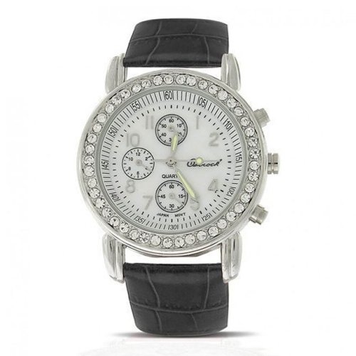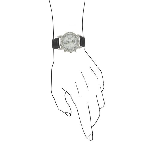 Dare to add a little sparkle to your look with this paved encrusted czs bezel, black genuine leather strap watch with buckle clasp. This chronograph allows you to read minutes, seconds, and military time, it's glow in the dark hour hands will allow you to read time day or night. Coordinate this watch with any ensemble from business casual to everyday wear.