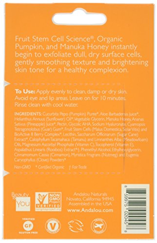 -. Feature : Organic pumpkin blended with Manuka honey and citrus glycolic AHA, gently dissolve and lift away dull surface cells, exfoliating and resurfacing for even tone and smooth texture / Fruit Stem Cell Complex helps revitalize for a brighter, more luminous complexion / For normal and combination skin / Made without sulfates, GMOs, petrochemicals, phthalates, parabens, synthetic fragrance, colors or preservatives / Non-GMO Project Verified, Gluten-Free, Cruelty Free
