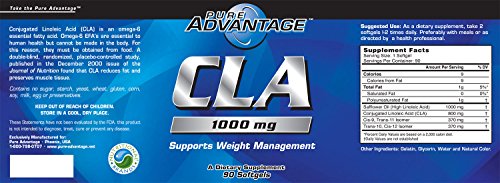 ReleaseDate : 2013-02-15 Studio : Pure Advantage Publisher : Pure Advantage Binding : Health and Beauty Product Description Pure Advantage CLA Conjugated Linoleic Acid (Omega-6) supports weight management, reduces fat and preserves muscle tissue. Benefits of CLA include increases in metabolic rate, decreases abdominal fat, enhanced muscle growth, lowering cholesterol and triglycerides, lower insulin resistance and reduces food-induced allergic reactions. Take 2 CLA supplement softgels 1-2 times daily for maximum effect and delivery of 1000 milligrams of linoleic acid; preferably take with food. Here at Nutritional Brands our formulas are never static; we carefully review our formulas to ensure we continue to offer you the most effective products with maximum bio-availability. 0