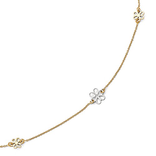 -. Binding : Jewelry -. Brand : The Black Bow -. Color : Yellow -. Department : womens -. Feature : Two tone 14k yellow and white gold / Approximate width 8mm / Adjustable 10 to 11 inch length / Average item weight is 1.52 grams / Includes our custom gift box -. Label : The Black Bow -. Manufacturer : The Black Bow -. Model : A8661 -. MPN : A8661 -. NumberOfItems : 1 -. PackageQuantity : 1 -. PartNumber : A8661 -. ProductGroup : Jewelry -. ProductTypeName : FINENECKLACEBRACELETANKLET -. Publisher : The Black Bow -. Studio : The Black Bow -. Title : 14K Two Tone Gold Polished Flower Station Anklet, 10-11 Inch