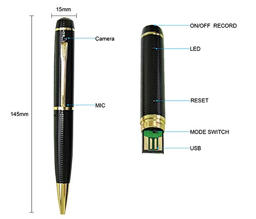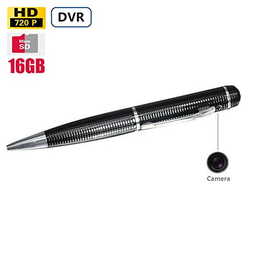 -. Feature : HIGH DEFINITION: Record in 1280×720 HD video resolution and 5 mega pixels,real high frame rate. / FREE 16GB Storage: The time can be setup so that you know exactly when the video/picture was taken. The pen itself is very professional, elegant, sleek, polished and can be used as an executive ball-point pen. Functions as a Webcam & DVR as well. Plug it into the USB port of your smart TV for instant picture and video viewing. Do it at your next family gathering and see the amazed look on everyone's face when they see themselves on / EASY TO USE: Simply record your footage, plug the spy pen camera into your USB 2.0 port on your computer with the included USB cable, and review your footage. That's all it takes! There is no need to install any drivers and absolutely no software to load. Very user friendly and a complete no brainer to use. / 100% COVERT: The light only comes on for a few seconds to let you know that recording has started, but then turns off. / BEST SPY PEN CAMERA: The Pen Camera records AVI video files which are compatible with Windows Vista,Win7 Win8. Once backed-up upload your videos to you favorite websites,such as YouTube,Facebook,MySpace and more.