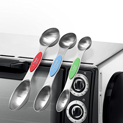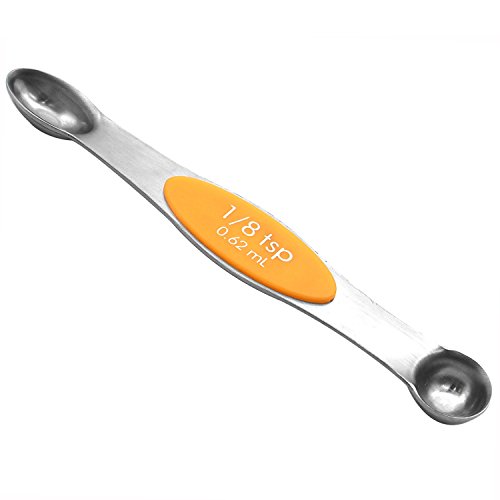 Set of 6 stainless steel magnetic spoons,exact measurements clearly shown in both English and Metric units:1/8 tsp, 1/4 tsp, 1/2 tsp, 1 tsp, 1/2 Tbls, 1 Tbls.