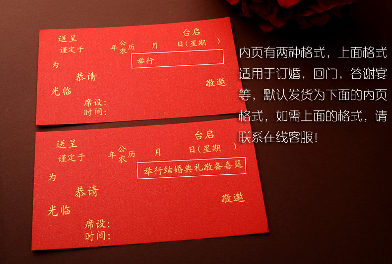 u0026nbsp;内页有两种格式,一种是普通的(即举行后面有固定的举行结婚典礼敬备喜筵的字样),另外一种是通用的(举行后面没有内容,可随意亲写上或者打印上举行答谢,或是回门等字样!)很方便哦!我们发货默认为举行后面有固定内容的,如需要举行后面没有内容的拍下请留言备注!