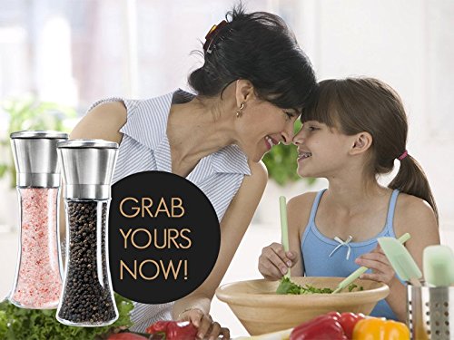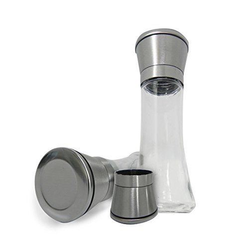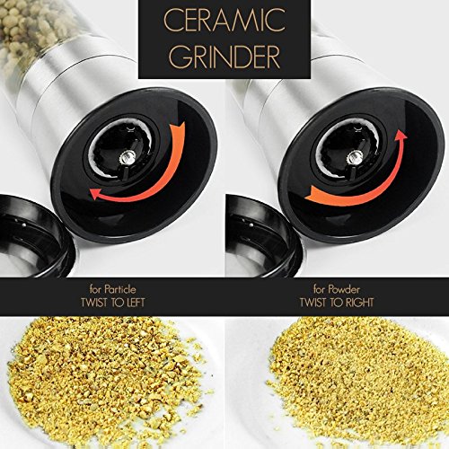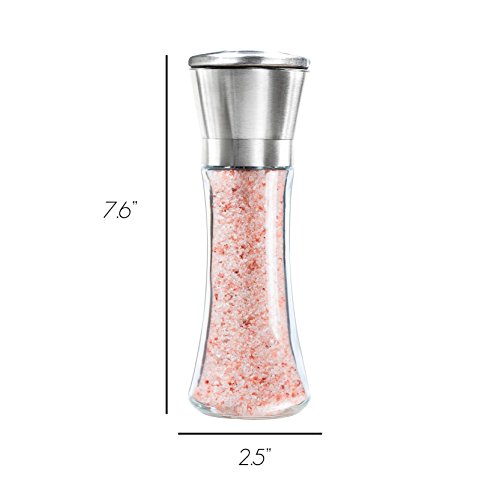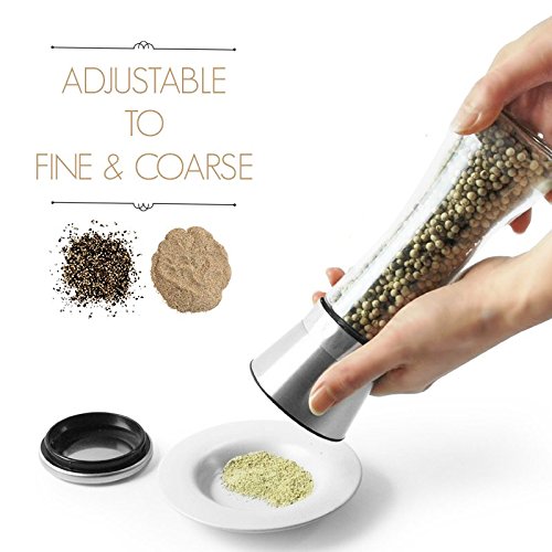 - --- Effortless to Use --- Simply twist the steel topper to mill/grind your salt or peppercorn. Adjustable between fine and coarse. No battery required! The grip is nonslip, and the transparent 6 oz body has wide mouth for easy refill.