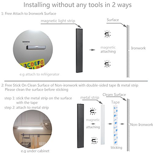 Upgrade Highlight: Magnets are inside the aluminium body of light bar,means it can be more freely and conveniently adsorbed on any ironwork position like refrigerator.In addition to,can also paste the sheet metal with 3M adhesive on other non-ironwork places for attracting the magnetic light bar.A perfect illumination at night for cabinets,closets,wine racks,top of wardrobe,bathroom,passageway,etc...