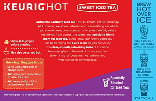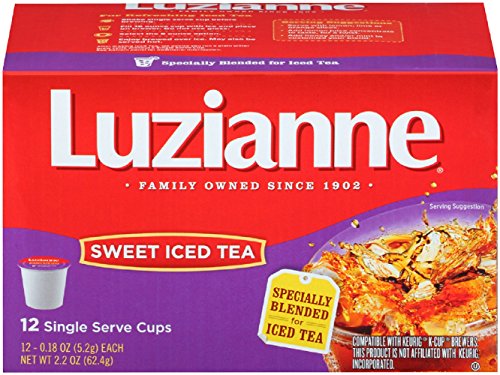 -. Binding : Misc. -. Brand : Luzianne -. Feature : Specially blended for making iced tea / Brew one ice cold glass at a time / For use in Keurig K-Cup Brewers (Not with 2.0) -. PackageQuantity : 2 -. ProductGroup : Grocery -. ProductTypeName : GROCERY -. Title : Luzianne Sweet Iced Tea K-Cups - 12 Single Serve Cups - Pack Of 2