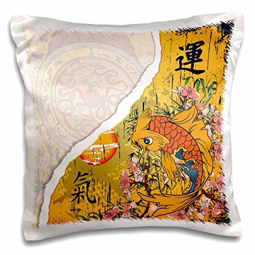 3dRose Oriental Japanese Kanji Luck Energy Koi Fish Pink Sakura cherry Blossom Flowers and Asian Symbols-Pillow Case, 16 by 16" (pc_116377_1)