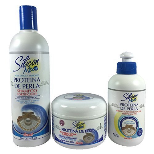 *Shampoo - PROTEINA DE PERLA FORTIFYING HAIR SHAMPOO Specially designed for dry, weak and fragile hair. CONTAINS : Pearl Extract a natural marine product that rejuvenates and fortifies the hair. Keratin to fortify the hair from root to ends. Silicons to smooth and to give shine. Lustre Finish to create lustrous, healthy looking hair, repelling humidity, avoiding frizz. *Treatment - Silicon Mix PROTEINA DE PERLA FORTIGYING HAIR TREATMENT Fortifying Hair Treatment Proteina de Perla repairs and nourishes the hair giving the shine, vitality and softness that it needs to look healthy and smooth. Contains Pearl Extract, a natural marine product that rejuvenates and fortifies the hair and Lustre Finish to create lustrous and healthy looking hair and repel humidity, avoiding Frizz. DIRECTIONS : Wash hair and apply with massage. Leave on 3 or more minutes depending on the condition of the hair. Rinse. SIZE : Net Wt. 8 oz. *Leave-in - Silicon Mix Proteina De Perla Leave-In Conditioner contains in its formula Silicons, Keratin, Ceramide and Silk Protein to revitalize and soften the hair. Contains Pearl Extract, a natural marine product to fortify the hair and Lustre Finish to avoid frizz.Feature