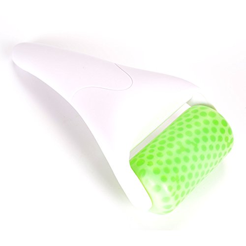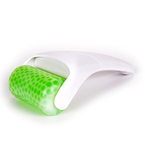 Skin cooling ice roller is a hand held device that has a water and gel filled rolling head that can be effectively frozen in the freezer.
