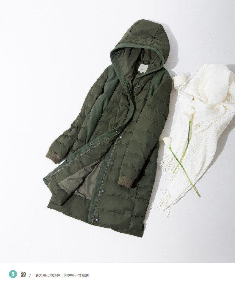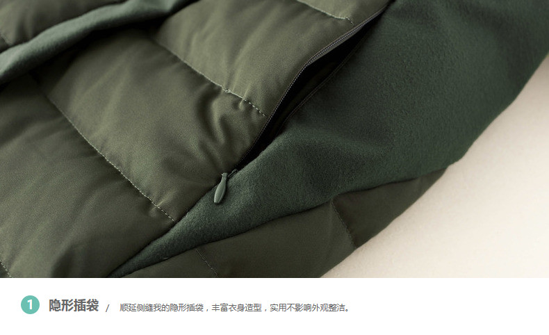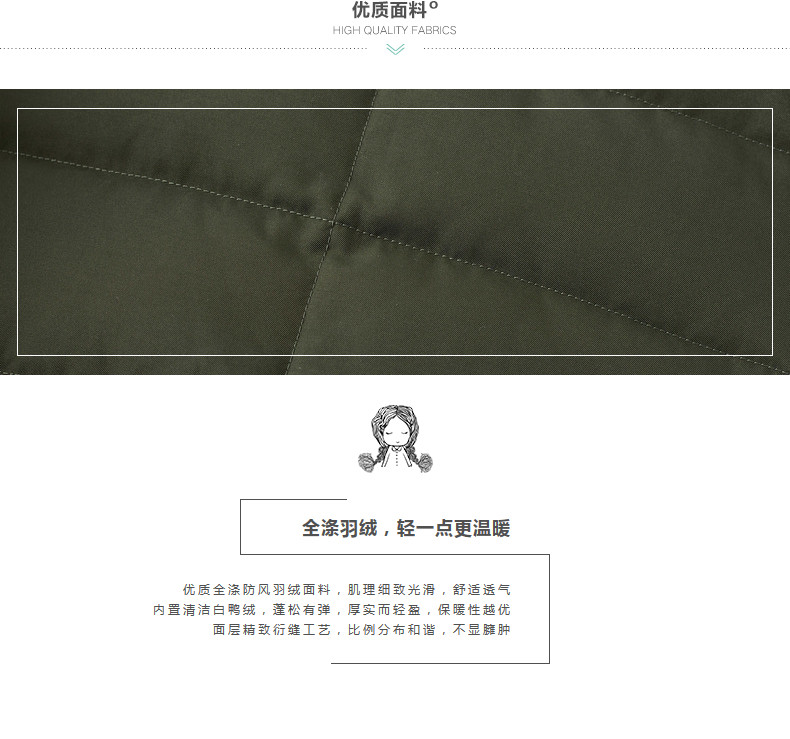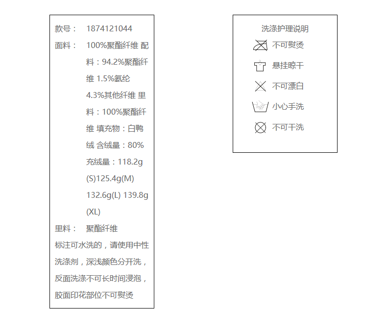 100%聚酯纤维 配料:94.2%聚酯纤维 1.5%氨纶 4.3%其他纤维 里料:100%聚酯纤维 填充物:白鸭绒 含绒量:80% 充绒量:118.2g(S)125.4g(M)132.6g(L) 139.8g(XL)