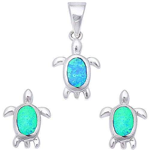 -. Feature : Turtle Motif / Earrings and Pendant Set / Lab created Blue Opal / .925 Sterling Silver