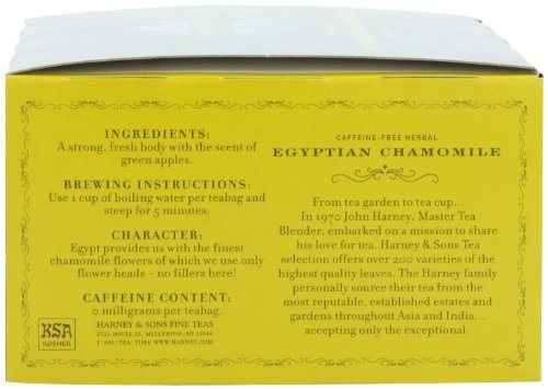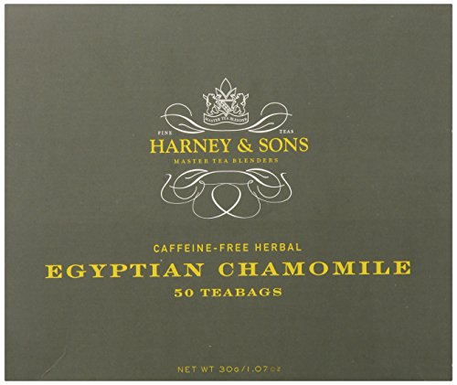 -. Binding : Grocery -. Brand : Harney & Sons -. EAN : 0636046101205 -. Feature : Egypt provides us with the finest chamomile flowers, we use only flower heads with no extenders / Drinking the liquor from the chamomile flower is very ancient and widespread through many cultures / Light-bodied tisane that has a light floral smell with a subtle smell of apples / Certified Kosher and caffeine-free / Steep for 5 minutes in boiling water before drinking -. Label : Harney & Sons -. Manufacturer : Harney & Sons -. Model : 16120 -. MPN : 16120 -. NumberOfItems : 1 -. PackageQuantity : 1 -. PartNumber : 16120 -. ProductGroup : Grocery -. ProductTypeName : GROCERY -. PublicationDate : 2013-03-27 -. Publisher : Harney & Sons -. Studio : Harney & Sons -. Title : Harney & Sons Egyptian Chamomile Herbal Tea 30g / 1.07 oz (50 Tea Bags) -. UPC : 636046101205