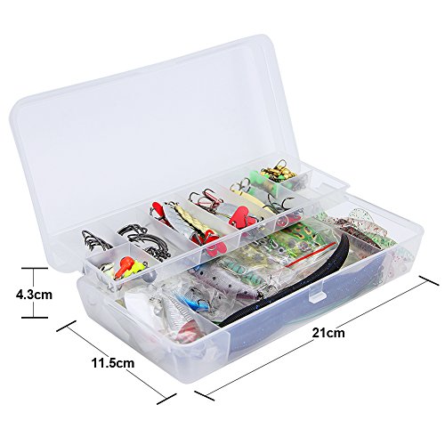 -. Feature : Natural looking 3D eyes,can swim and swerve underwater just like real fish that will give you an advantage in fishing / These fishing bait used to catch freshwater and saltwater fishing. With Strong hook makes it impossible for fishes to escape / Adopts high-quality ABS as material,Eco-friendly, tasteless, non-toxic in material.102pcs tools meets your all needs,you do not need to buy other accessories from other sellers. It's a perfect tools for fishing lovers / This set has vivid fishing lures, sharp hooks and various fishing tackle.Suitable for different kinds of fishes / With a free tackle box that is both durable and lightweight. keeping all your pieces organized and compact, easy to carry