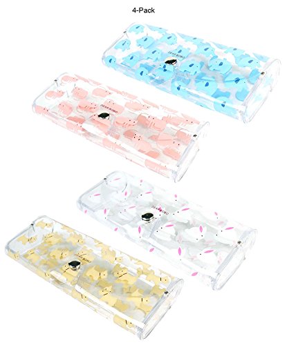Product Description Protect your eyeglasses in these adorable clear eyeglass cases! The 4 pack comes with 4 cases. The clear cases feature an animal print. The flexible material is clear so you can easily see what glasses are inside each case. . The cases fit most standard sized glasses. The eyeglass cases do not take up much room in a purse, or when stored on a bathroom counter. Protect your eyeglasses and store them in these adorable eyeglass cases. 0