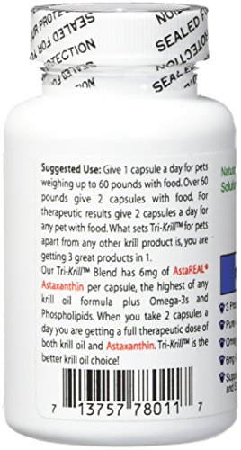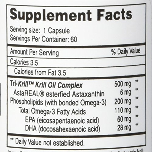 Tri-KRILL contains the highest level of astaxanthin in any Krill Oil product with 12.0 mg per 2 capsules. The non-GMO Astaxanthin comes from the best source, microalgae Haematococcus pluvialis and is produced by AstaREAL, the must studied astaxanthin in the world.Rich in Omega-3 fatty acids Antarctic krill oil provides more benefits than either fish oil or flax seed alone.Serving Size: 1 Capsule/Day. Servings per bottle 60 Per Capsule: Tri-KRILL Krill Oil Complex 500 mg Phospholipids 200 mg Total Omega-3 Fatty Acids 110 mgEPA 60 mg DHA 28 mg Astaxanthin 6 mg Ingredients:100% Pure Euphausia superba Antarctic Krill Oil, Haematococcus pluvialis Astaxanthin, Cellulose, Water.Note: The date on the bottom starting with MFG is the manufactured date, not expiration date.