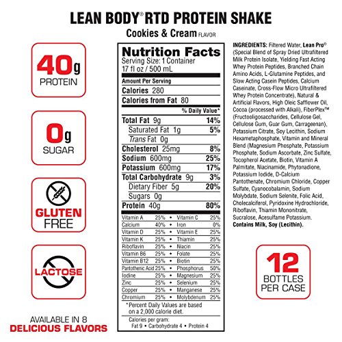 LABRADA NUTRITION - Lean Body RTD Whey Protein Shake, Convenient On-The-Go Meal Replacement Shake for Men & Women, 40 grams of Protein – Zero Sugar, Lactose & Gluten Free, Cookies & Cream (Pack of 12