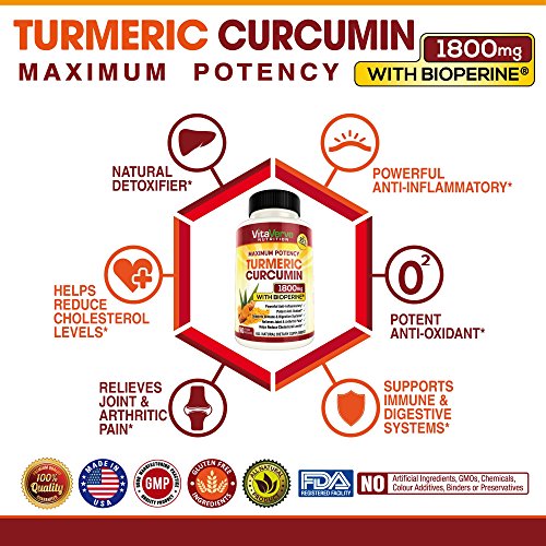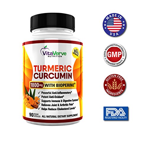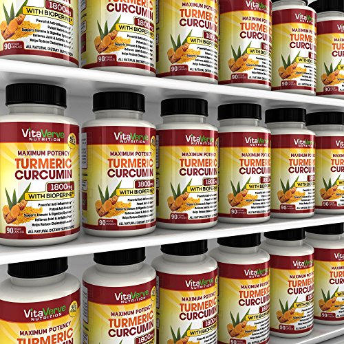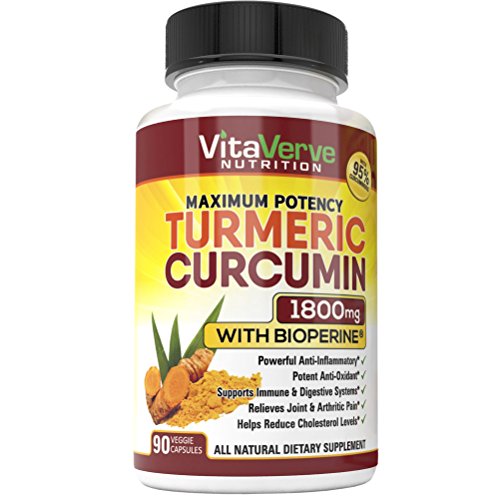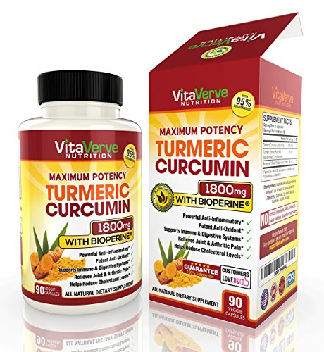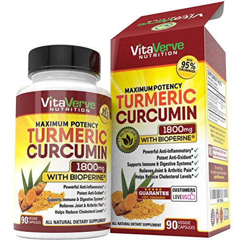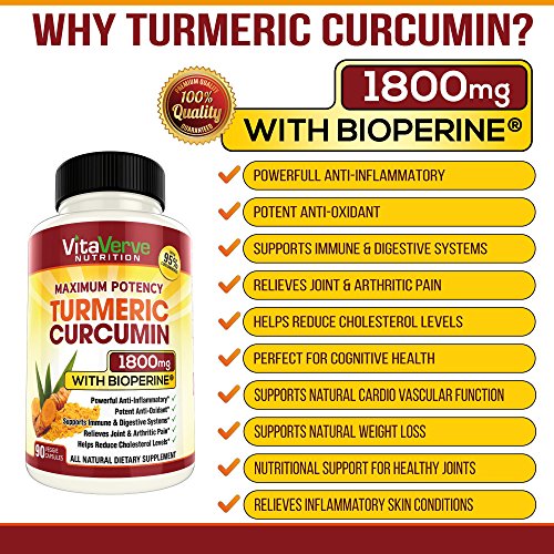 Maximum Potency Turmeric Curcumin 1800mg with Bioperine® for enhanced absorption is the Newest Advanced Formula from VitaVerve Nutrition. The Ancient Ayurvedic Medicine That Has Modern Research Excited Over 3000 studies can't be wrong! Turmeric, and it's antioxidant, anti-inflammatory curcuminoids is the cornerstone in natural pain relief, healthy joint support support, fluid retention, and inflammation, as well as serving a multitude of other health conditions* But When You Combine Turmeric Capsules With Black Pepper... Well, now you're taking things to a whole new level. Lab research demonstrated a 2000% increase in bioavailability by combining these two spices together. ... So Turmeric supplements with patented BioPerine were born! And Now VitaVerve Has Boosted This Potent Anti-Inflammatory To A New Level - 2 x Bioperine for extra absorption! Our capsules contain 10mg (instead of 5mg) of this patented black pepper extract for greater results.