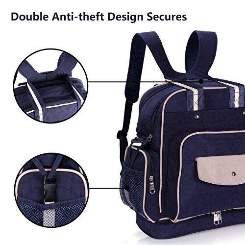 Langforth Baby diaper bag offers easy transportation of everyday essentials for moms and dads on the go. The diaper bag greatly reduces the stress and anxiety that accompanies traveling with babies. The spacious main compartment plus 18 pockets inside and out to equip and organize all essentials required in dealing with your unpredictable precious little one on the move. Highly adjustable, the bag can be hand held, shoulder strapped, backpacked, and hooked onto luggage handles. Waterproof and mildew resistant expandable bottom storage can house wet items such as small umbrellas, swimming suits, cold beverages, and soiled clothing. Unique double anti-theft design prevents pickpockets from accessing the main compartment from behind