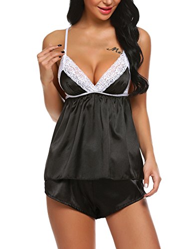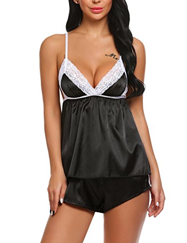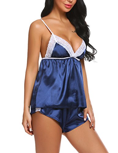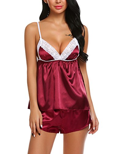 -. Feature : Smooth satin, breathable and comfortable; V-neckline camisole, designed with lace-trimmed, adjustable spaghetti straps with elastic waistband and lace details shorts for a romantic look. / Material: 92% Polyester, 8% Acrylic / Great Valentines day gift for her. Amazing item for sleepwear, nightwear or loungewear. / 2 Pieces lingerie cami set pajamas. Available in Black, White, Wine Red, Dark Blue from S to XXL / Garment Care: Hand-Wash(Max 40°C)