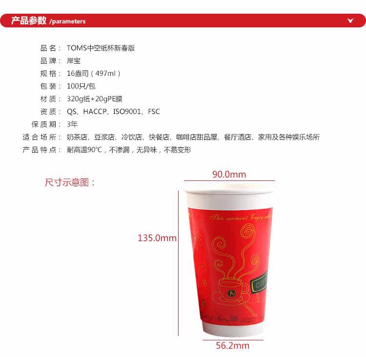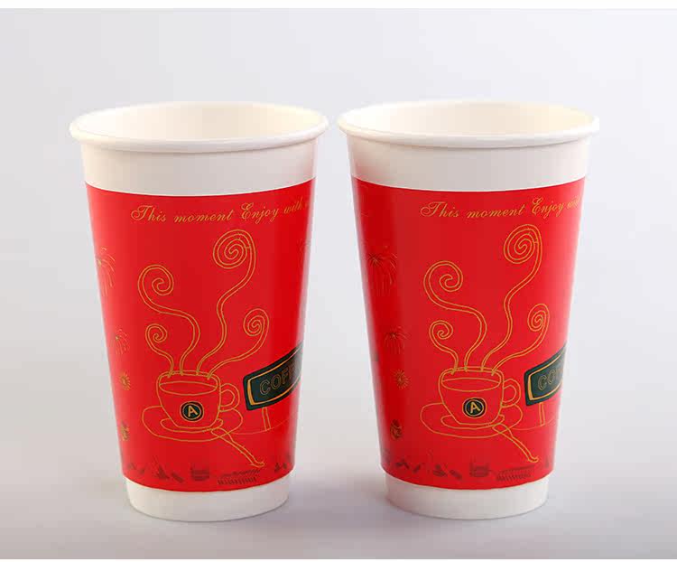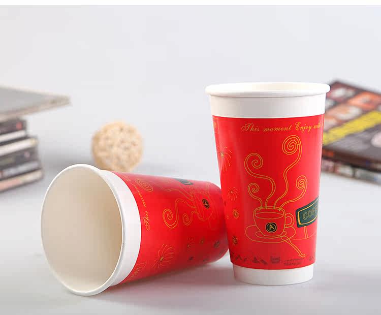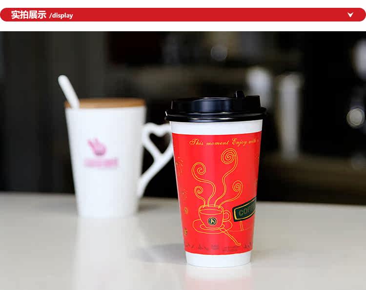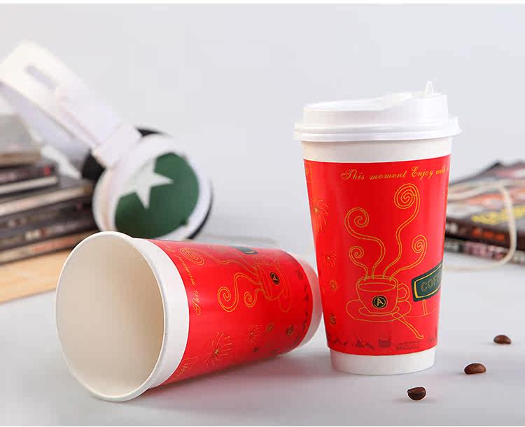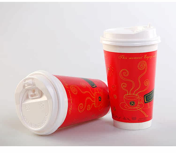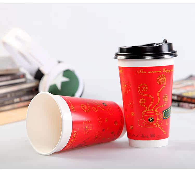 一次性纸杯咖啡奶茶纸杯新春版双层加厚热饮杯带盖100套
